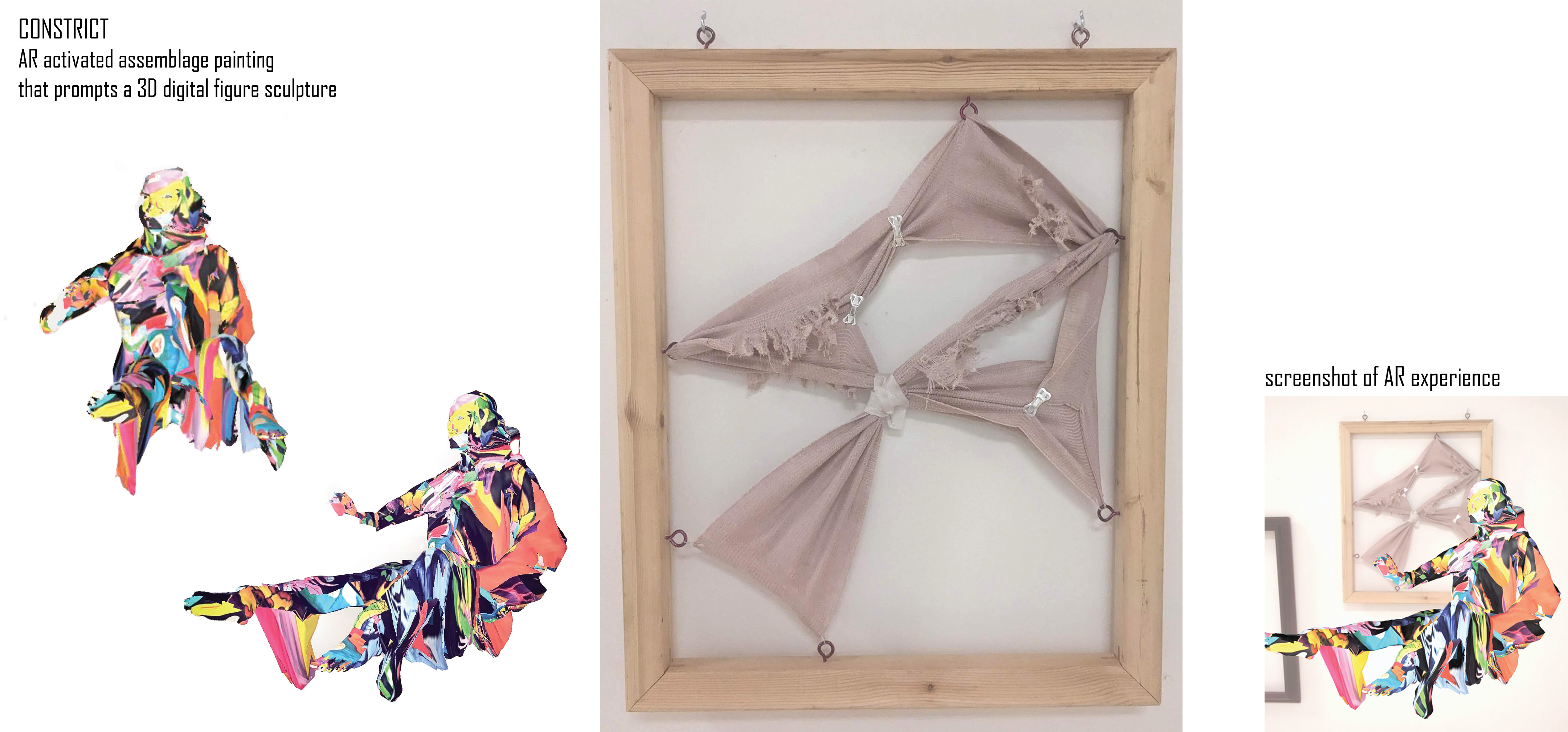 wood, ace bandage wrap, medical tape, butterfly pins, AR activated 3D figure sculpture